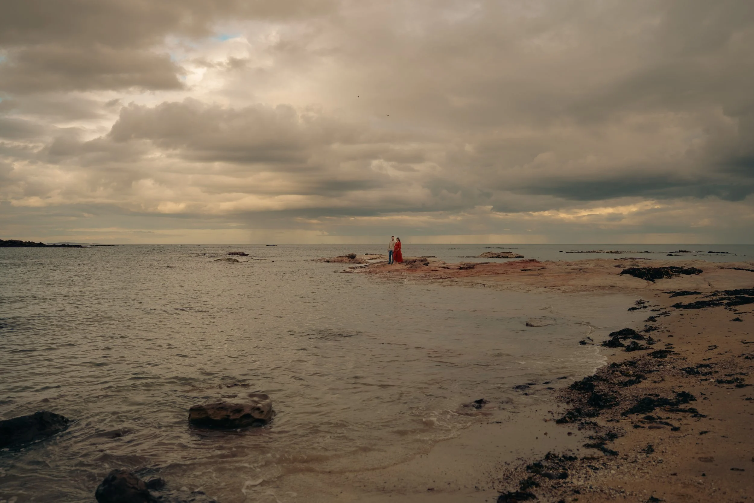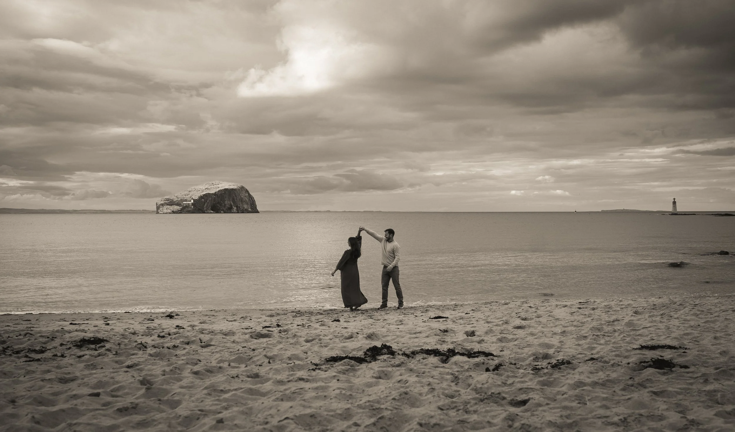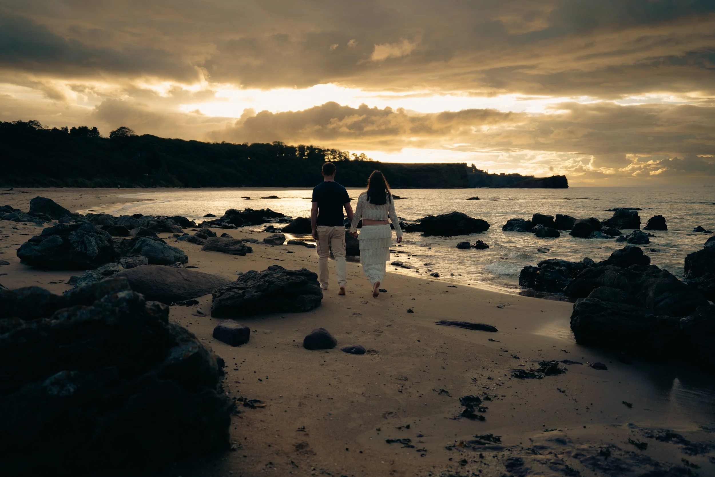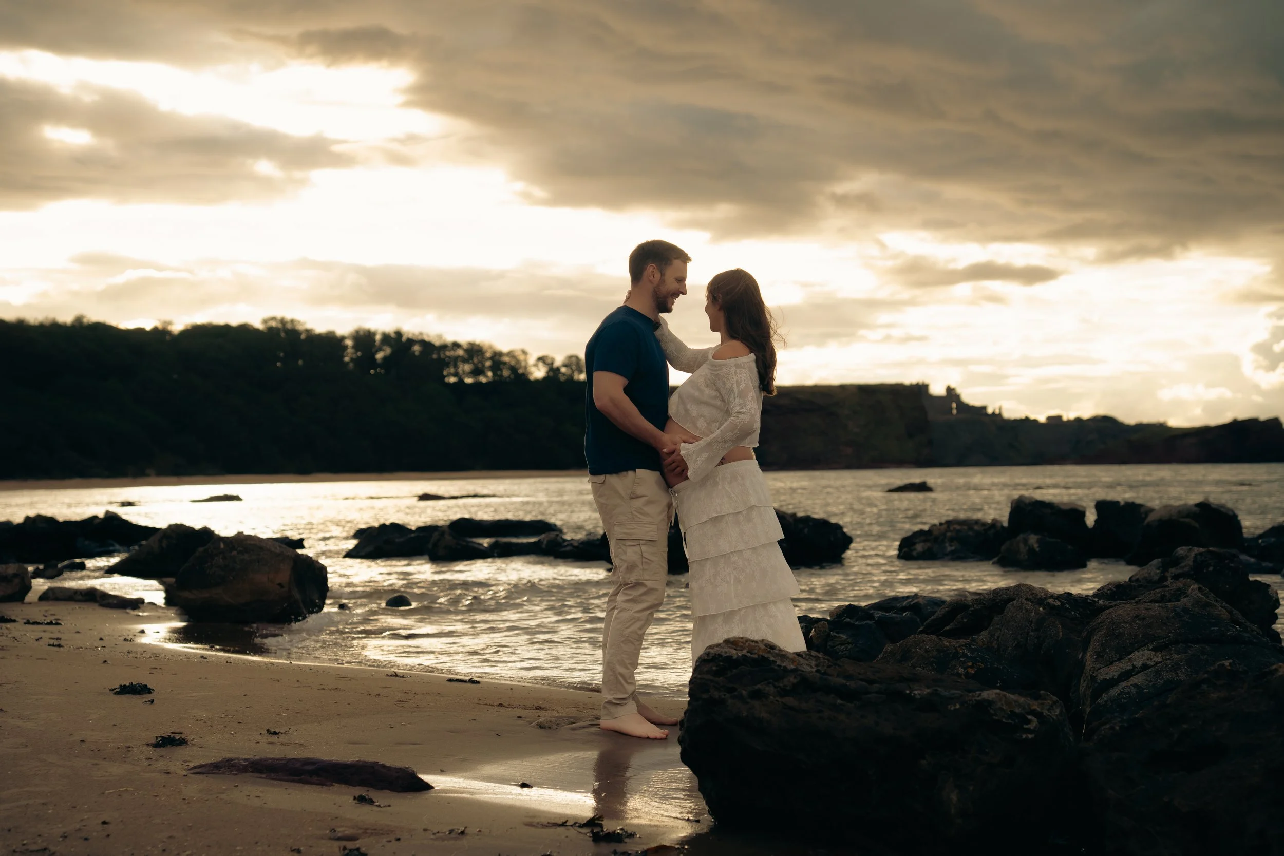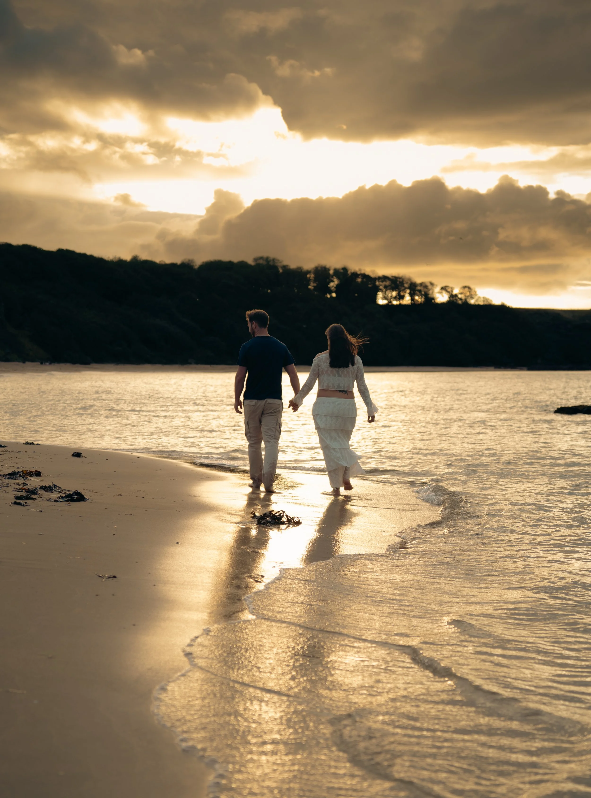 We spent the whole shoot on the beach, wandering, climbing out onto rocks for the shot, taking our chances with footing and timing, and just letting it all unfold. No jackets, no fuss - just soft light, salty air, and that feeling of being exactly where you’re meant to be. As golden hour hit, they changed outfits and danced along the water’s edge, completely in their own world. The kind of moments you can’t plan, can’t pose, just there for a second and then gone again. Exactly the ones that matter most.