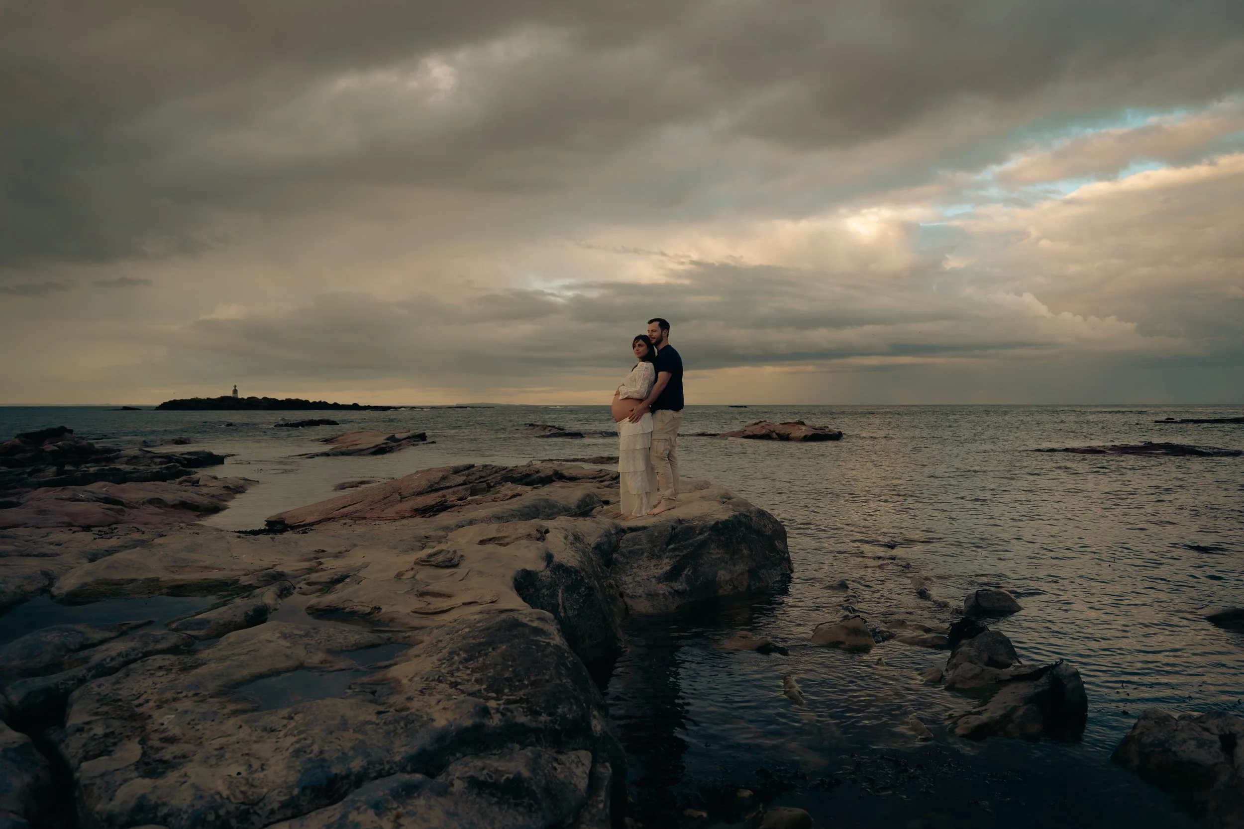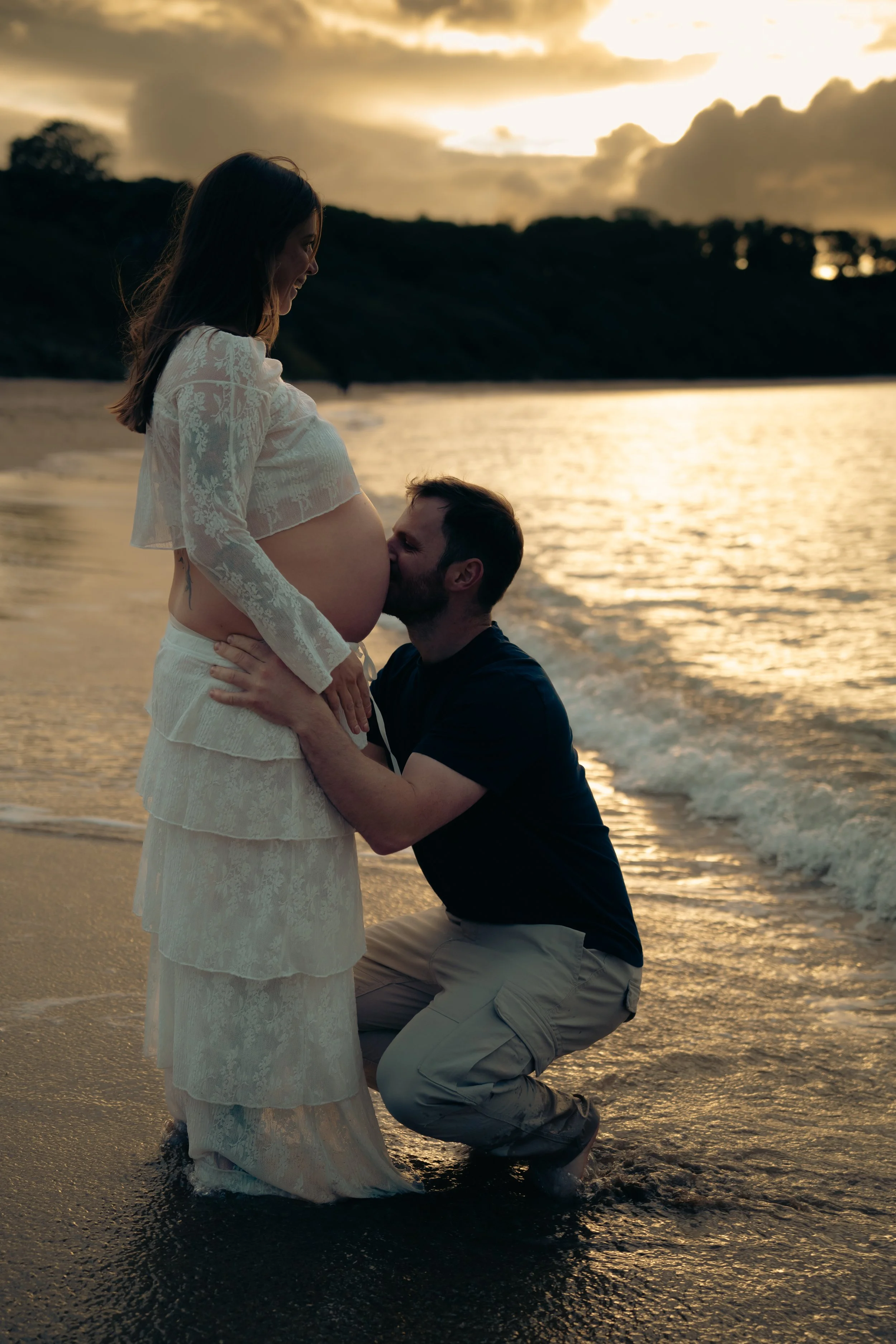 There they were, growing a tiny human, strolling the shore, letting the golden light chase every step.
